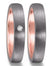 Unter der graphitgrauen Oberfläche aus längsmattierten Tantal schlägt ein wundervolles, strahlendes, Herz aus Rotgold. Bei dieser Betrachtungsweise wird es einem bei dem Anblick dieser schönen 4 mm breiten und 2.6 mm dicken Bicolor Eheringe warm um das Herz.