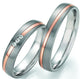 Herzklopfen verursachen diese eleganten 4.5 mm breiten Bicolor Eheringe aus den Werkstätten der Trauringschmiede Nowotny Collection Ruesch. Das asymmetrische Design mit dem Fundament aus Titan, Platin, Weißgold oder Palladium und dem schmalen, rund 1 mm breiten, rotgoldenen Randstreifen ist ein Eyetcher. Das ist zu einem großen Teil auch der strichmattierten Weißen und der hochglanzpolierten roten Fläche zu verdanken. Zusätzlich hebt die feine Rille, welche die Farben und Strukturen trennt, den Unterschied hervor. Ein besonderer optischer Leckerbissen ist der Damenring dieses Ringpaars. In die Weiße Straße sind hintereinander und mit einem kleinen Abstand drei kleine, gegenläufig angeordnete, Dreiecke eingearbeitet. In jedes dieser Dreiecke hat der Edelstein Fasser einen strahlenden Brillant eingesetzt. Die drei edlen Steine haben insgesamt 0,06 Karat.