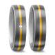 Eigenschaften:Schicke und stilsichere Titan-Gelbgold Eheringe aus der "Ti for Two Collection" des Hauses TitanFactory. Die 6.0 mm breiten Ringe mit dem eleganten, seitlich versetzten 18 karat Gelbgoldstreifen, drücken Ruhe und Souveränität aus. Unsere Künstler haben ein zeitloses Ringpaar geschaffen an dem Sie lange Freude haben werden. Bei dem Ring der Braut wird, bei dem an sich schon eindrucksvollen Ringpaar ein strahlender Diamant in den matten Titanuntergrund eingebettet. Die Ringe sind auch einzeln oder ohne Brillanten bestellbar. Bitte senden Sie uns hierfür eine Email.